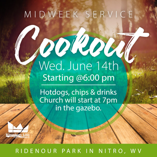 Join us for a fun afternoon at our Midweek cookout and service! Cookout will begin at 4:00pmHot Dogs, Chips and DrinksChurch will start at 7:00pm in the gazebo